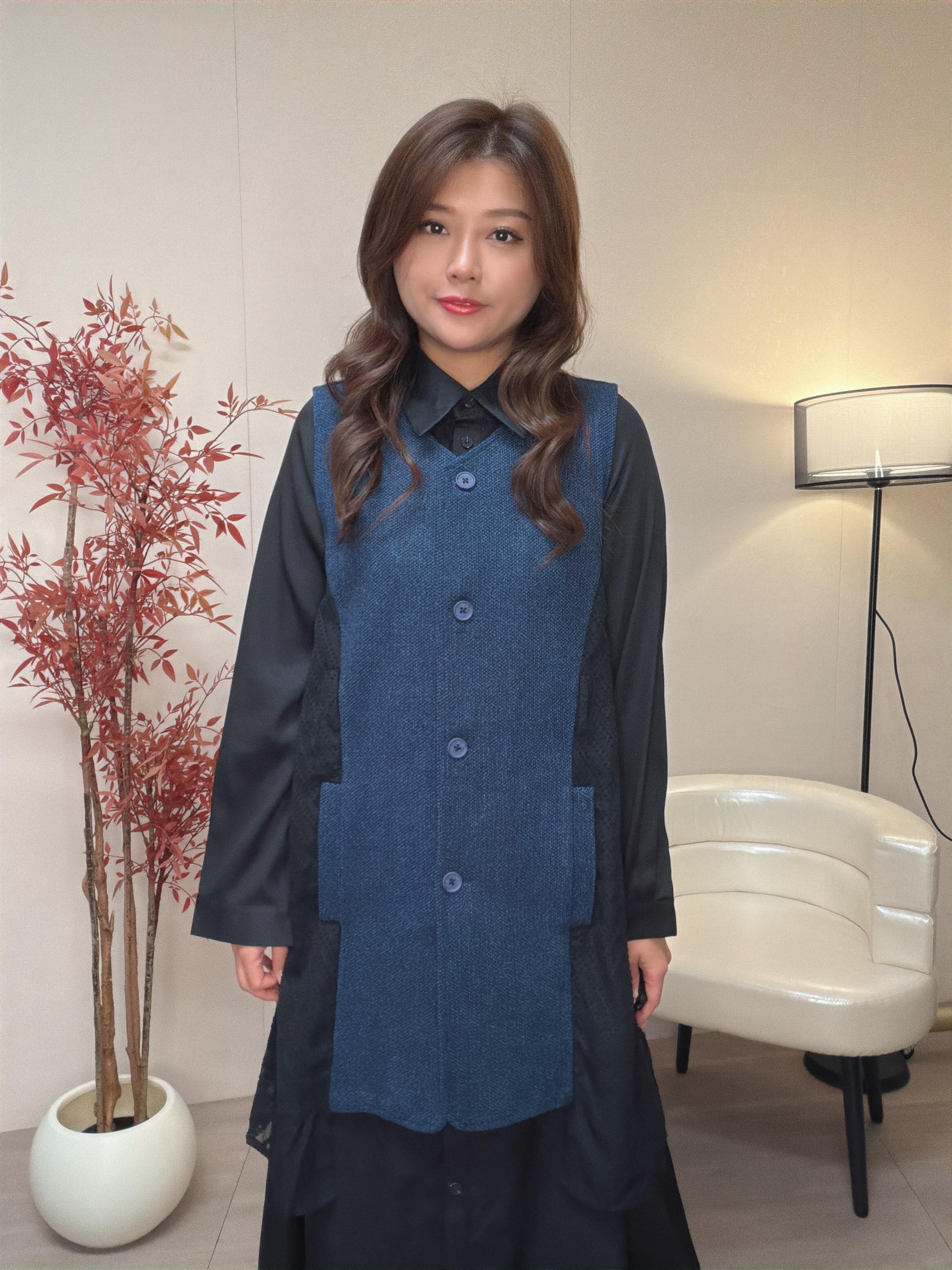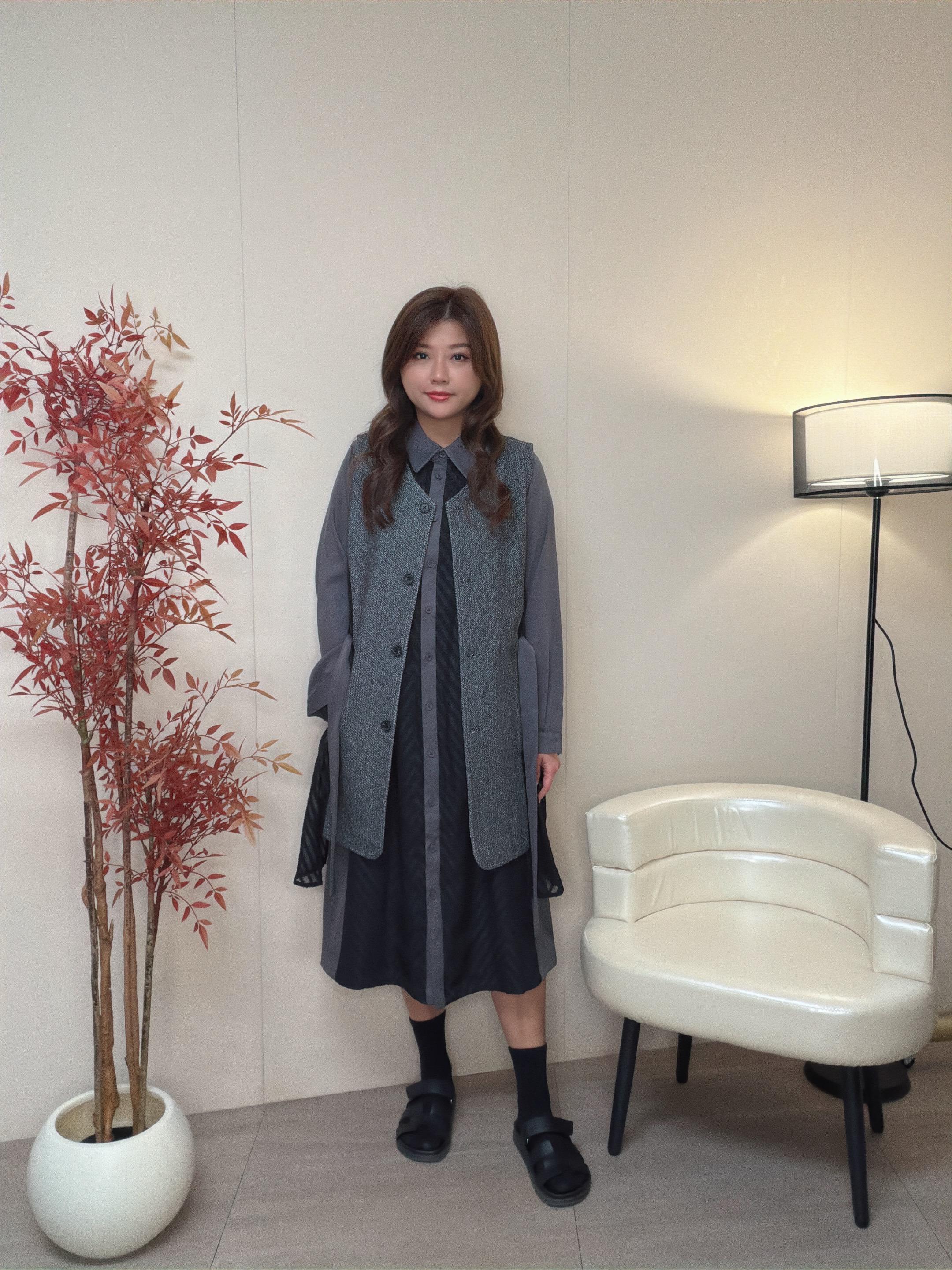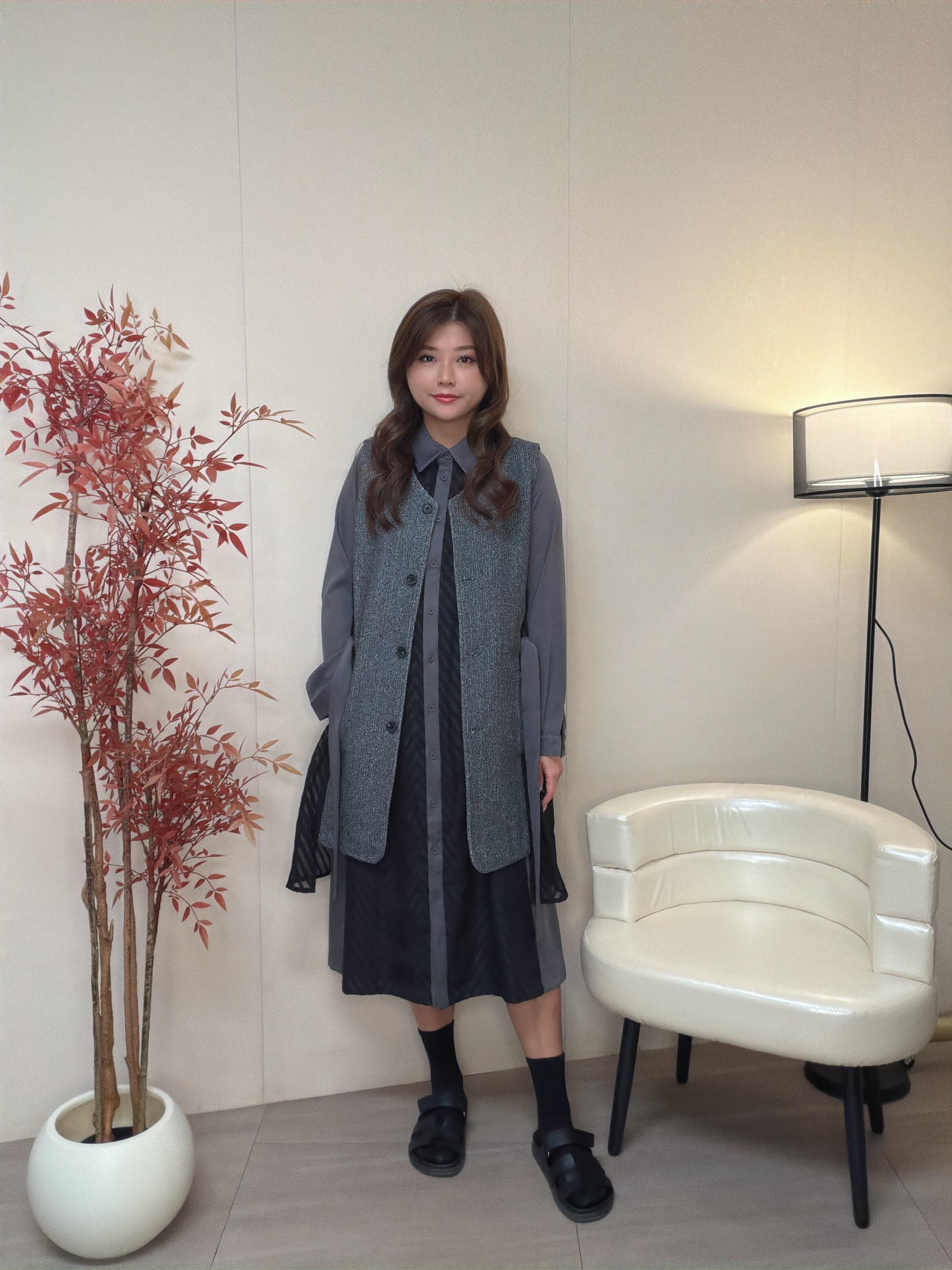 外套是V領背心主部是粒絨布兩側是v 形提花雪紡布 帶出瘦腰修身效果