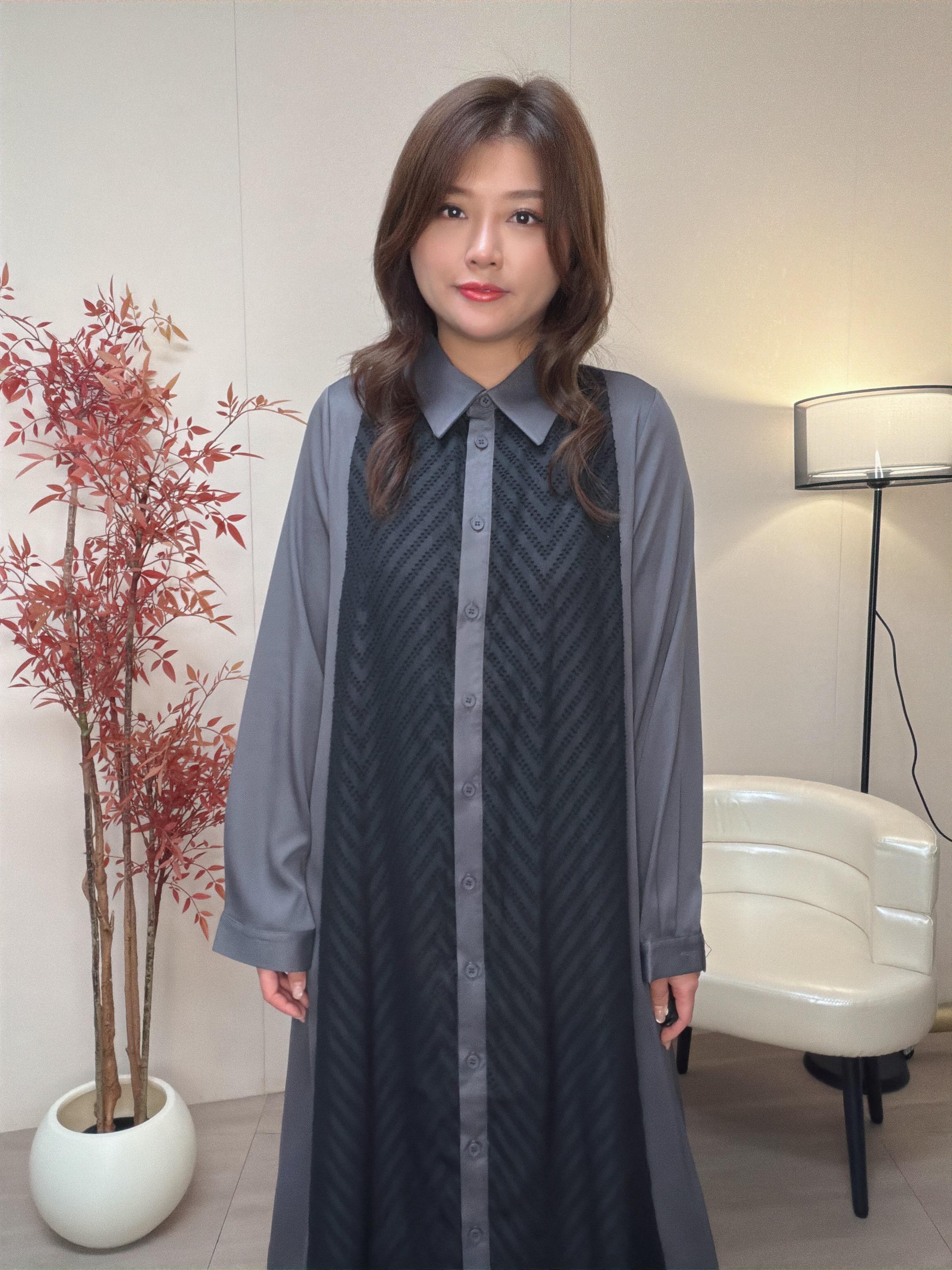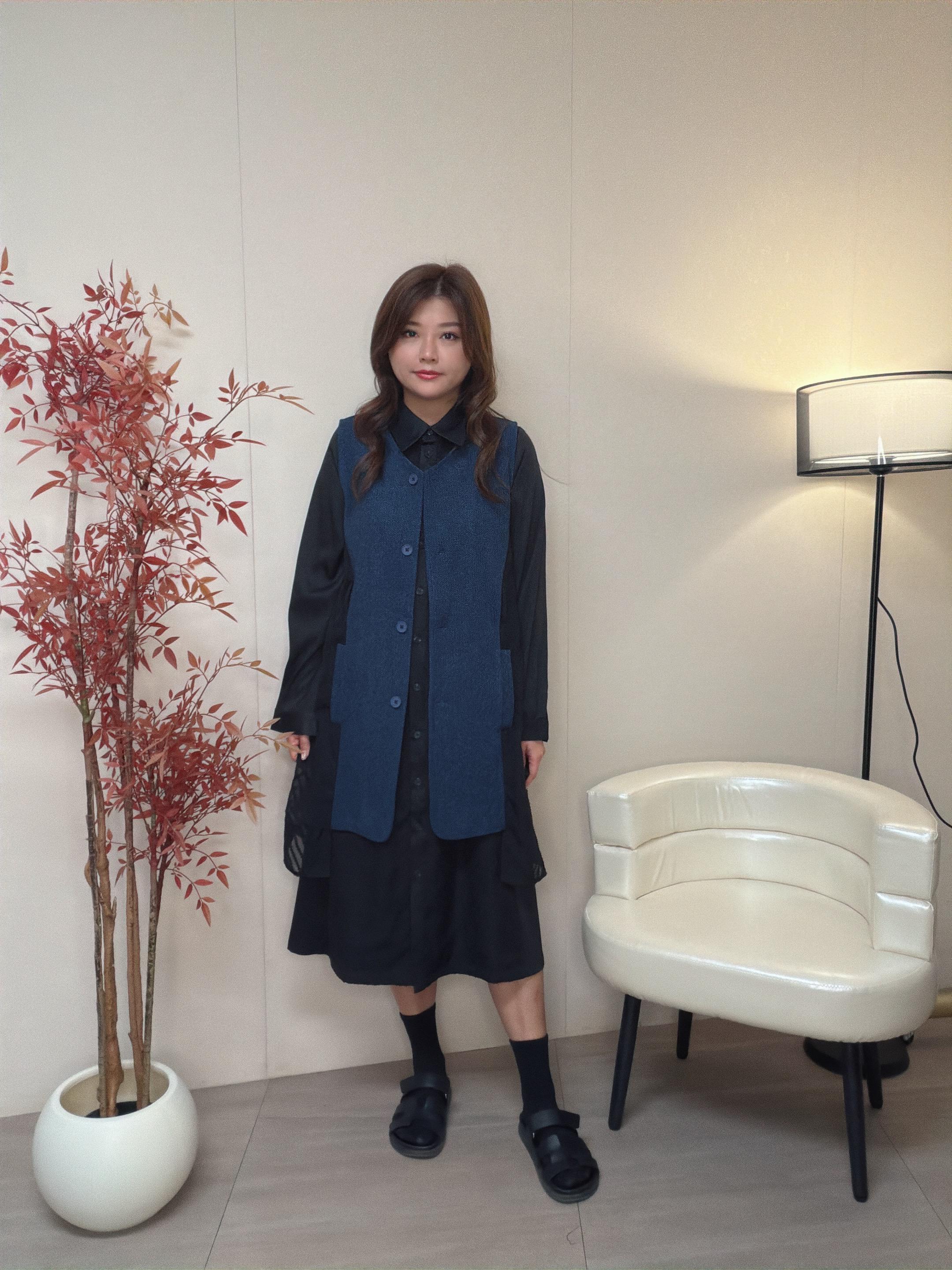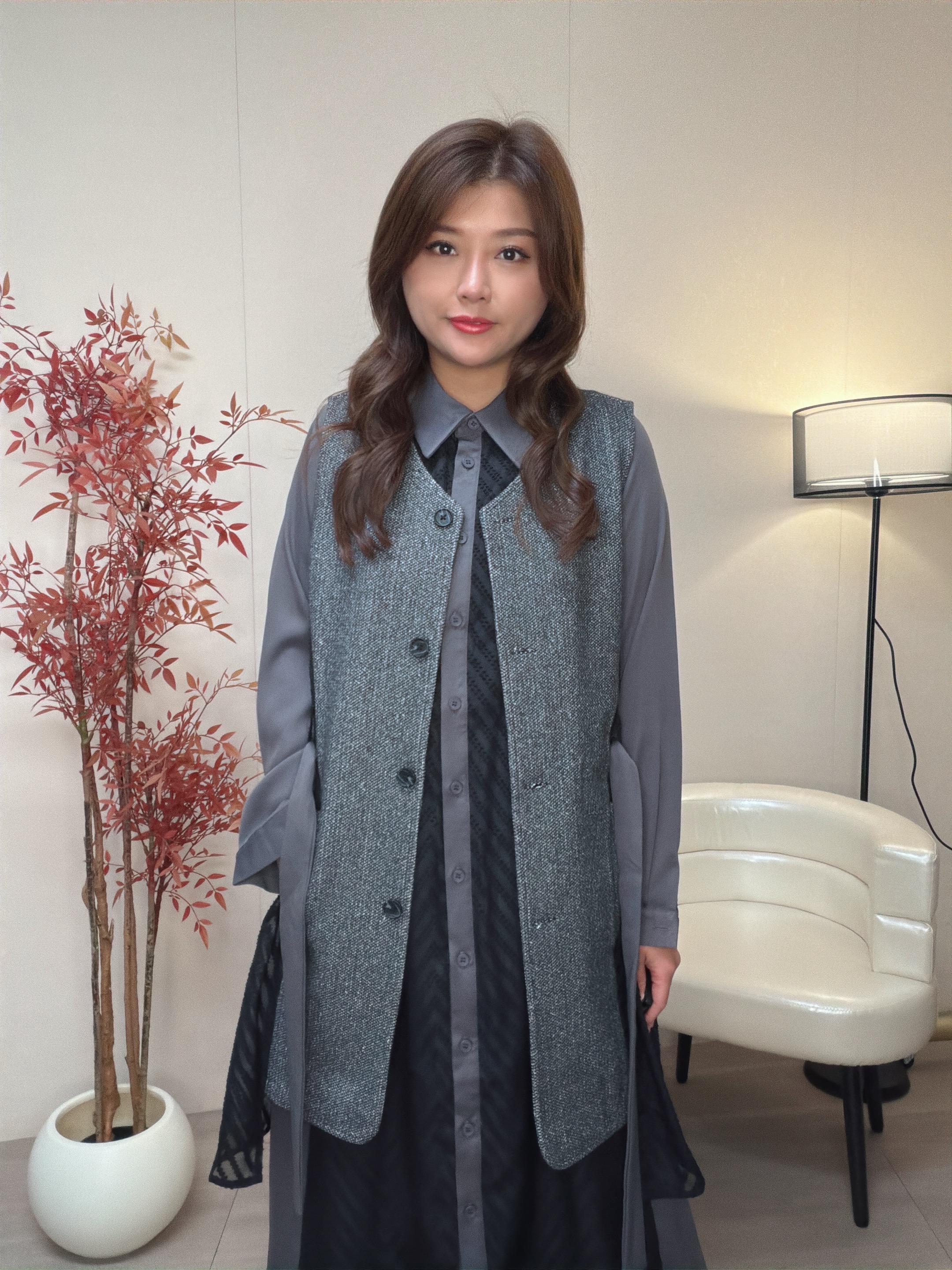 外套是V領背心主部是粒絨布兩側是v 形提花雪紡布 帶出瘦腰修身效果