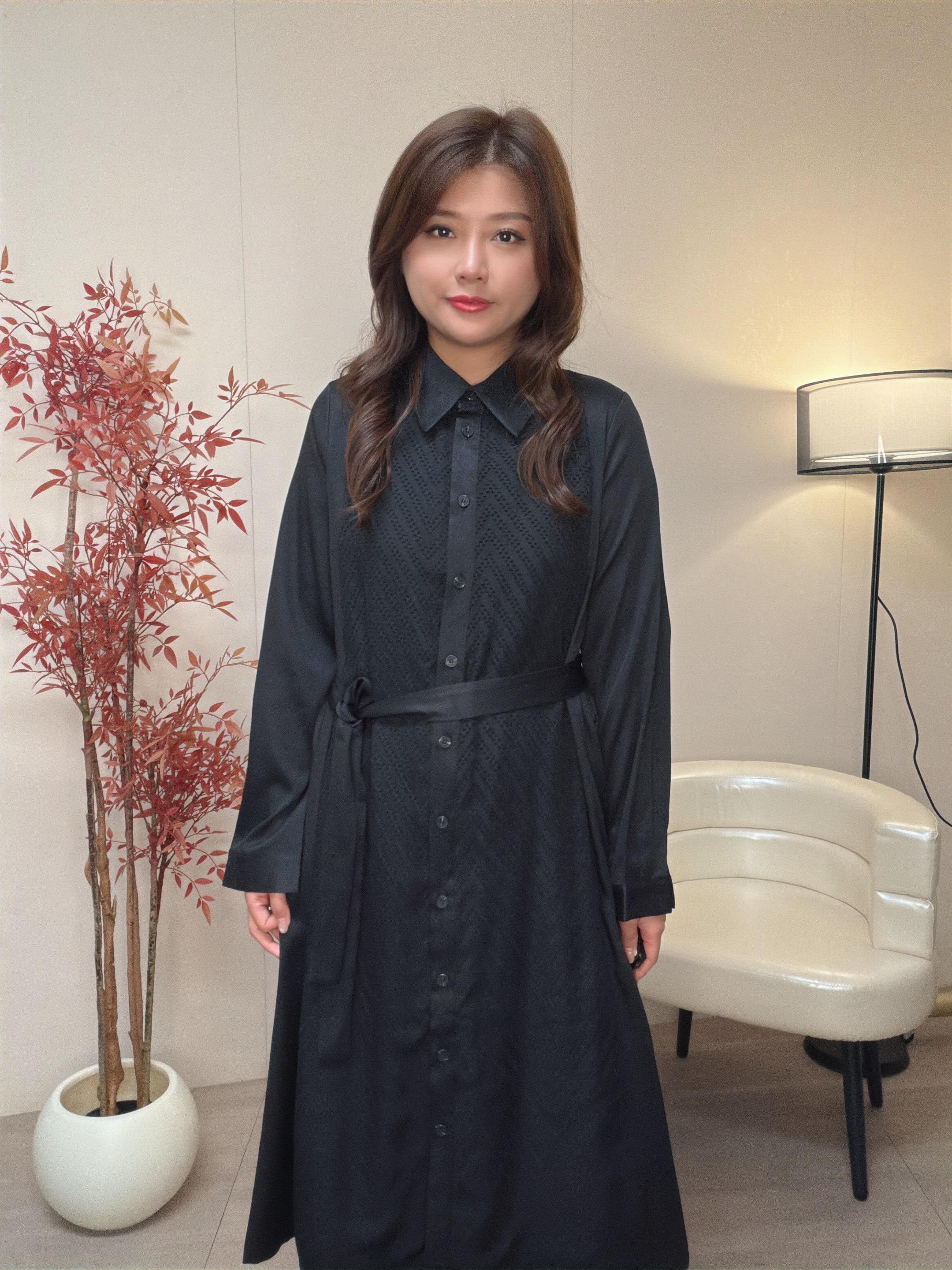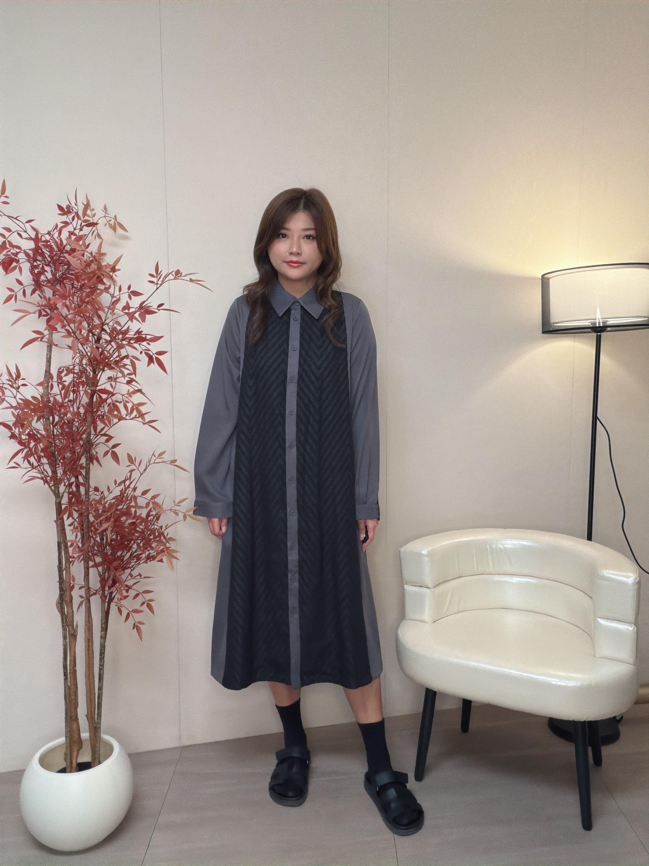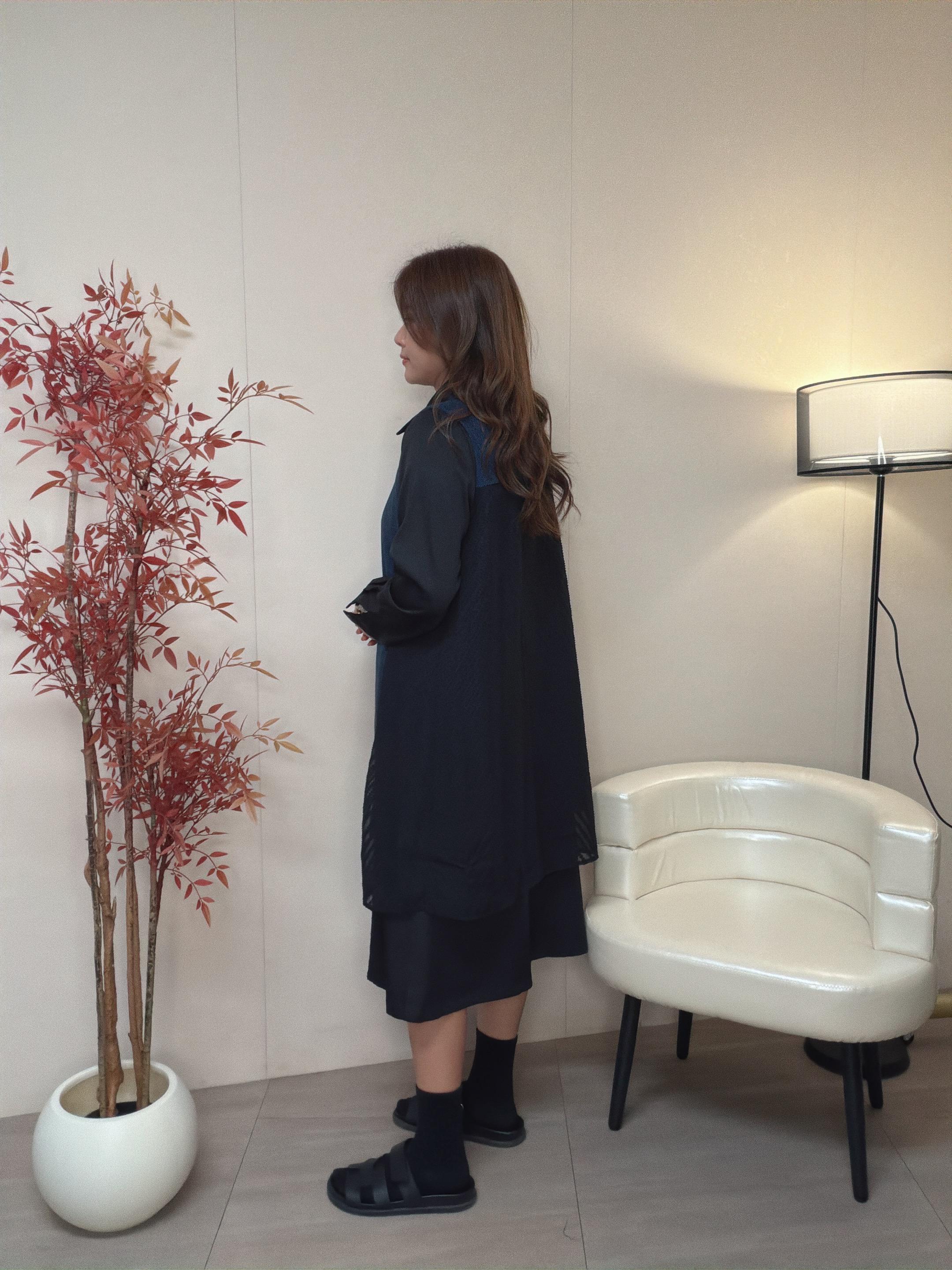 內裙滑身梭織布拼v 紋雪紡布於 前中兩側 營造層次效果 內裙亦可以單着。
