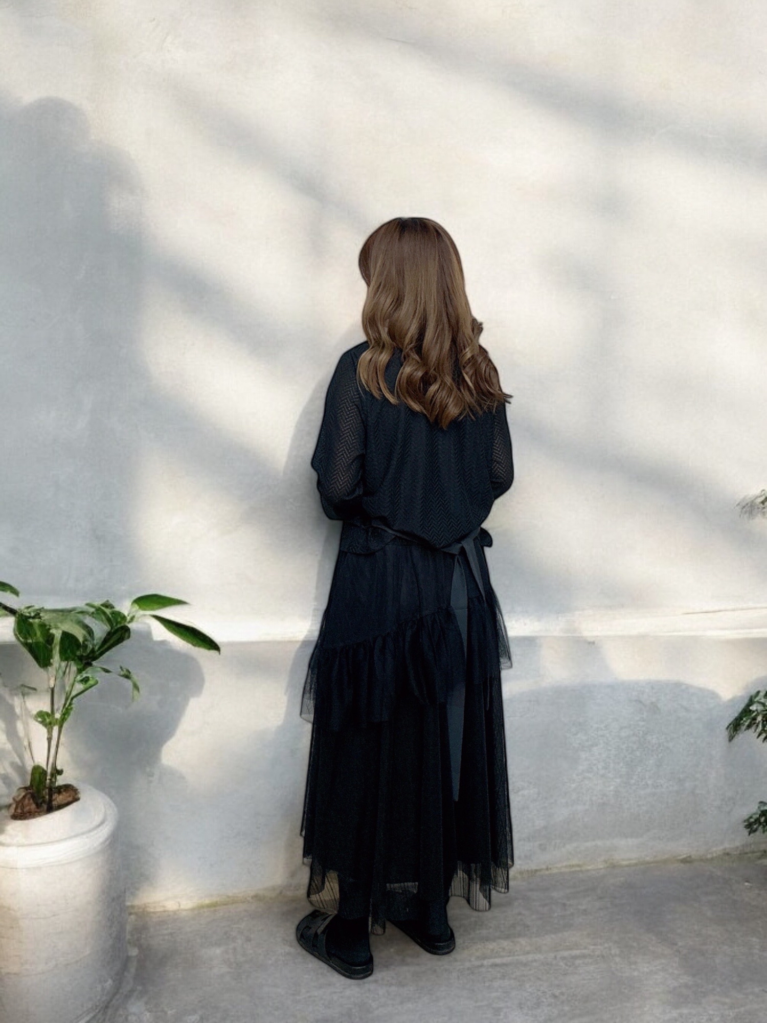103430 BS366 仿兩件網紋袖拼下紗紗連身裙