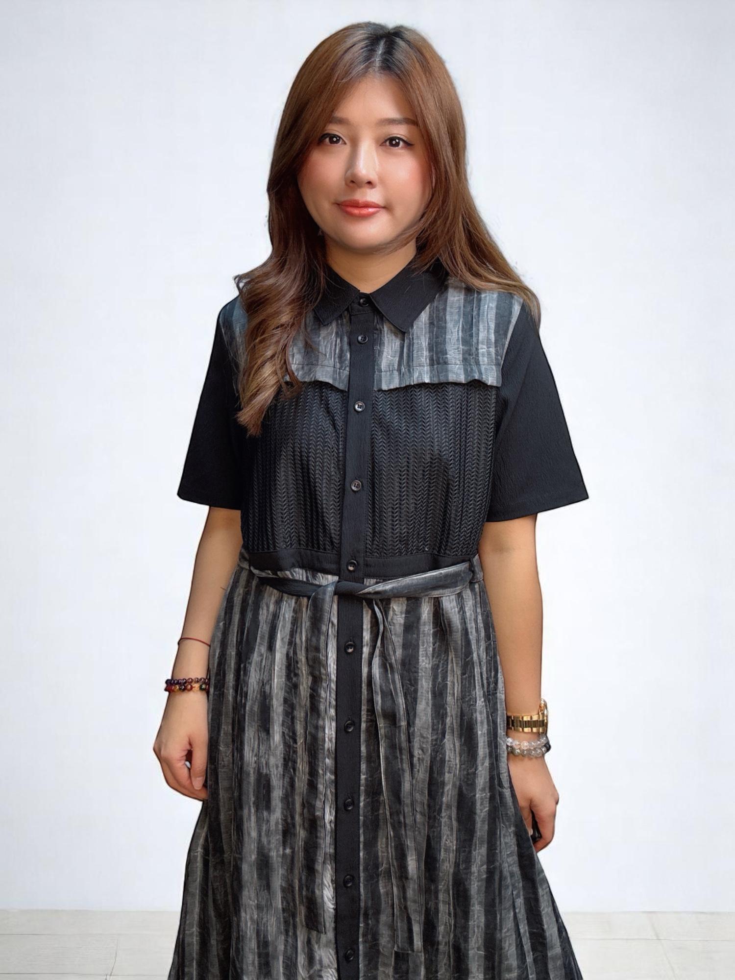 103611 BS370 暈染條子雪紡布拼波浪紋提花網布連身裙